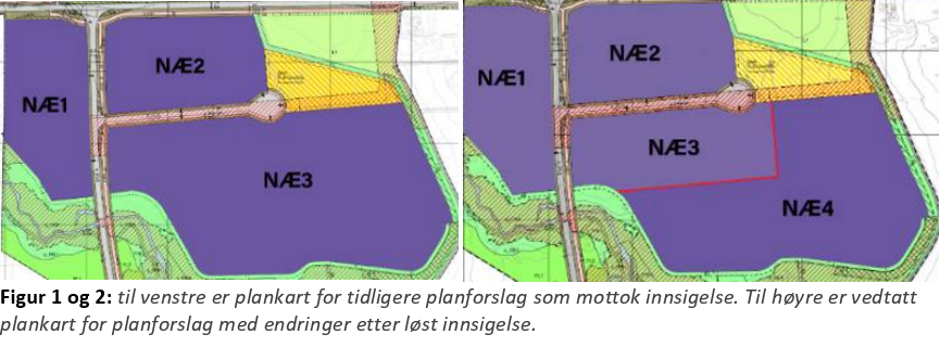 Planforslaget er nå bearbeidet og oppdatert etter pålegg fra Statsforvalter. Endringene innebærer oppdeling av NÆ3 til to felt (NÆ3 og NÆ4), krav om omdisponering av myrmasser og beskrivelse av massehåndtering, samt tydeligere bestemmelser for utnyttelsen og utbyggingen av NÆ1-4.